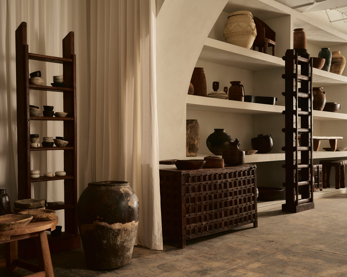 Nestled in Mississauga, Vintage Connection is a charming, hidden gem for lovers of all things vintage. Specializing in rare and exquisite pieces, this boutique offers an enchanting selection of handcrafted, antique pieces sourced from around the world. The intimate, serene atmosphere of the store invites visitors to take their time, explore, and appreciate the beauty of vintage artistry, whether they’re searching for a statement piece or a subtle addition to their collection. The design embraces the beauty of imperfection, transience, and simplicity, creating a serene, harmonious space that feels both natural and timeless. With its focus on understated elegance, this design philosophy is beautifully complemented by soft, flowing drapery in neutral beige tones. The warm, earthy hues of beige bring warmth and softness to the room, grounding the aesthetic in simplicity and comfort. Imperfect textures,from the drapes to the choice of furnishings, evokes a quiet appreciation for the transient nature of life, resulting in a space that feels both soothing and profoundly connected to nature.